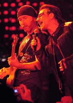 Recta final del concierto, y empezaron a tirar de los más grandes temas... al tiempo que el líder los recubría cuando acaban (o comenzaban) de una capa de parafernalia político-solidaria con pseudomensaje (You know... take II). Pero poco me importaba, cuando The Edge comenzó a hacer sonar uno de los mejores (y más característicos) riffs que ha dado la música del siglo XX, con ese inconfundible sonido (automáticamente la gallina de piel, of course...) para lo que sería el tercer momentazo del concierto. Sí, habéis adivinado bien con lo del riff que no era otro que el que abre ’Pride (In the name of love)’ Madre mía!, repito Madre mía!; totalmente sin respiración, sin tímpanos, sin voz me dejaron aquí.... pero con una sensación de las que pocas veces se tienen... Por si fuera poco, Bono se había ido a buscar toda la voz que se había dejado con la miss Bosnia, y la encontró, y of course II, otro final de estos apoteósicos, you know.. (In the naaaaaame of looove -- Uuooooh oh oh,oh!)